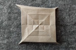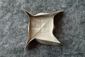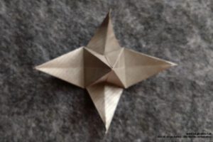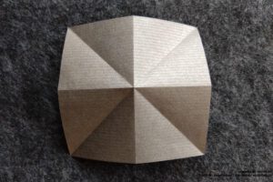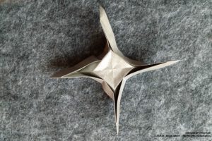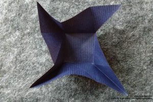 5. Die Spitzen werden alle aufeinandergefaltet, sodass ein Modell entsteht, bei dem an einer Seite ein geschlossenes Papier mit rechten Winkel ist und gegenüber vier Spitzen übereinander.