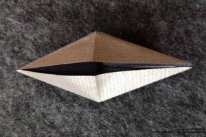 4. Die letzte Faltung wird geöffnet und die obere Lage des Papiers wird an der zuletzt entstandenen Faltlinie nach oben gefaltet, bis eine Art „Boot“ entsteht. Der Schritt wird auf der Rückseite wiederholt.