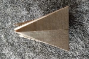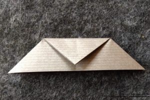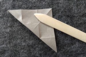 3. Das überstehende Dreieck wird über die Flügel gefaltet, am besten mit dem Falzbein die Faltlinie nachziehen, das hilft beim nächsten Schritt.