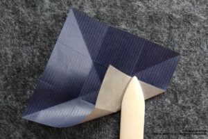 3. Das überstehende Dreieck wird über die Flügel gefaltet, am besten mit dem Falzbein die Faltlinie nachziehen, das hilft beim nächsten Schritt.