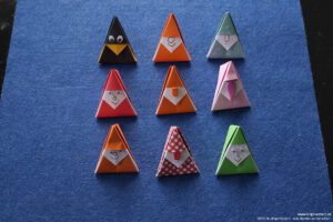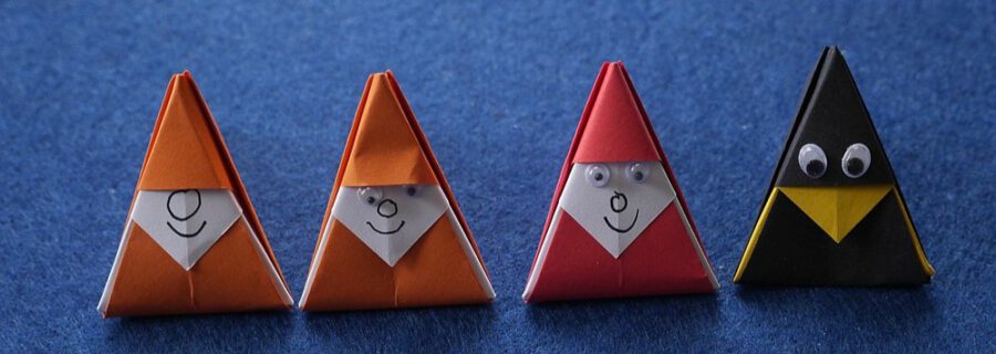 Kürzlich wollte ich wieder einmal bei einem Spaziergang Fotos mit meinem Papierraben machen. Er war jedoch verschwunden und so habe ich überlegt, wie ich ihn einfacher falten könnte als beim letzten Mal. Ich erinnerte mich an eine zweiteilige Dreieckschachtel, die ich vor Jahren kennengelernt habe. Die habe ich nun etwas verändert, damit mein Rabe einen schwarzen Kopf und einen gelben Schnabel bekommt. Als ich von dem Spaziergang zurückkam, dachte ich, ich könnte in dieser Weise auch Weihnachtswesen und Wichtel falten und prompt war ich im Experimentier- und Faltrausch.
