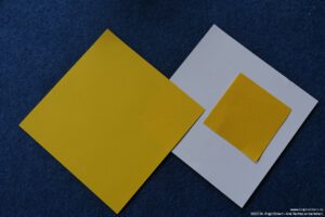 Du benötigst zwei Blätter Papier im Format 10 x 10 cm und ein Blatt Papier im Format 5 x 5 cm. (Andere Formate gehen natürlich auch, dabei sollte das kleinere Blatt jeweils ein Viertelquadrat der größeren Blätter sein!)