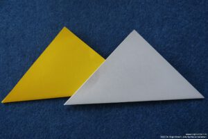 - Falte zwei aneinanderstoßende Kanten zu der Diagonale, sodass ein „Drachen“ entsteht.
