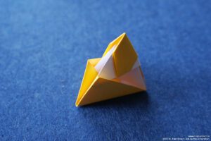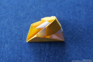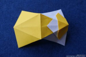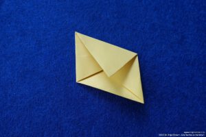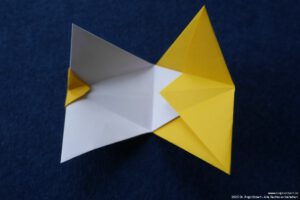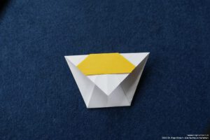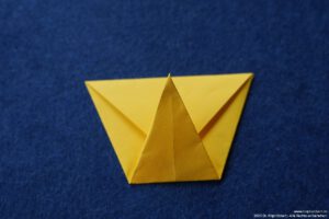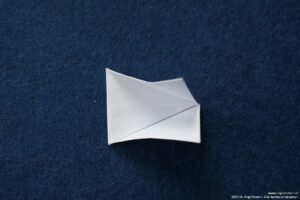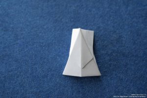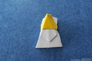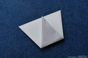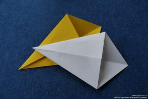 - Falte die überstehenden Ecken hinter das „Kopfpapier“ und falte die Bergfalten des „Körpers“ nach.