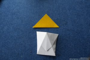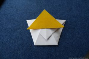 - Falte das kleine Quadrat diagonal in der Mitte und lege es auf die obere Hälfte des „Kopfes“.