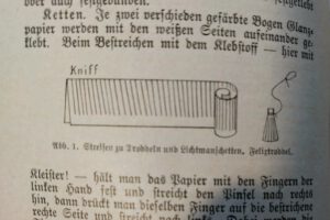 Aus welchem Jahr mein Exemplar von Gustav Gasts „Der junge Pappkünstler“ stammt, kann ich nicht genau ermitteln, aber es muss über 100 Jahre alt sein. Auch wenn es vor allem Papparbeiten enthält, finden sich doch einzelne Papiergestaltungen.