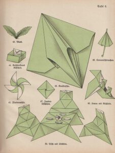 Das war eine Detektivarbeit, das Erscheinungsjahr vom 2. Heft „Das Falten“ der Reihe „Die Fröbelschen Beschäftigungen“ von Marie Müller-Wunderlich herauszufinden. Und dann fand ich ein datiertes Werbeblatt des veröffentlichenden Brandstetter Verlags für die erste Auflage 😊
