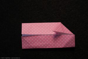 7. Die rechte überstehende Ecke entlang es überliegenden Dreiecks falten. Das wird das Hinterteil.