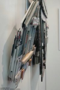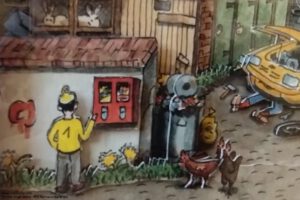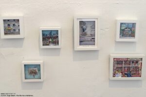 In meinen Papier-Workshops nenne ich die Technik, aus der Michael Wienand die Bilder, die man übrigens auch kaufen oder individuell anfertigen lassen kann, „Rizzi-Technik“. Vielleicht muss ich sie umbenennen, auf jeden Fall werde ich im nächsten Workshop darauf hinweisen, dass es in Dortmund einen Künstler gibt, der mit dieser Technik und eigenen Zeichnungen „Heimatgeschichten aus dem Ruhrgebiet“ erzählt. Das Grundprinzip ist einfach, aber sehr mühselig, man benötigt mehrere exakt gleiche Bilder, eines bleibt als Basis vollständig, die anderen werden zugeschnitten oder es werden Elemente ausgeschnitten. Die Teile werden mit Abstandhaltern montiert, sodass eine 3D-Wirkung entsteht. Ich arbeite ja gerne mit Altpapier, da haben wir vor Jahren die Einladungskarte zu einer Hundertwasser-Ausstellung im Workshop verwendet. Michael Wienand zeichnet seine Vorlagen mit Tusche und koloriert sie mit Aquarellfarben. Von den Vorlagen werden Kopien produziert, aus denen die Teile ausgeschnitten werden.